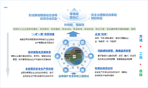 煤礦安全生產(chǎn)保障支撐體系是充分研究借鑒國際通用的安全管理體系架構(gòu),以國家法律法規(guī)、技術(shù)標(biāo)準(zhǔn)為基礎(chǔ),運(yùn)用煤礦安全系統(tǒng)工程理論,構(gòu)建以安全目標(biāo)為引領(lǐng),風(fēng)險(xiǎn)分級管控、隱患排查治理和風(fēng)險(xiǎn)防范化解三大機(jī)制構(gòu)建為核心,以安全生產(chǎn)標(biāo)準(zhǔn)化管理體系基本要求為主線,通過體系、雙庫建設(shè)的方式方法,借助安全、技術(shù)等數(shù)智化保障支撐工具,實(shí)現(xiàn)安全生產(chǎn)責(zé)任制全面落實(shí)、標(biāo)準(zhǔn)化動(dòng)態(tài)達(dá)標(biāo)的目標(biāo)。切實(shí)補(bǔ)上煤礦在安全管理方面的短板、弱項(xiàng),最終實(shí)現(xiàn)“零事故、零傷亡”的宏偉目標(biāo)。